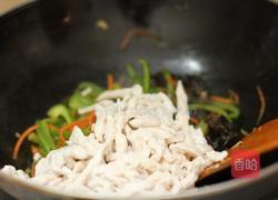 3. 热锅凉油,油温5成热时,下入腌制好的鸡丝,快速滑散,变色后捞出备用。